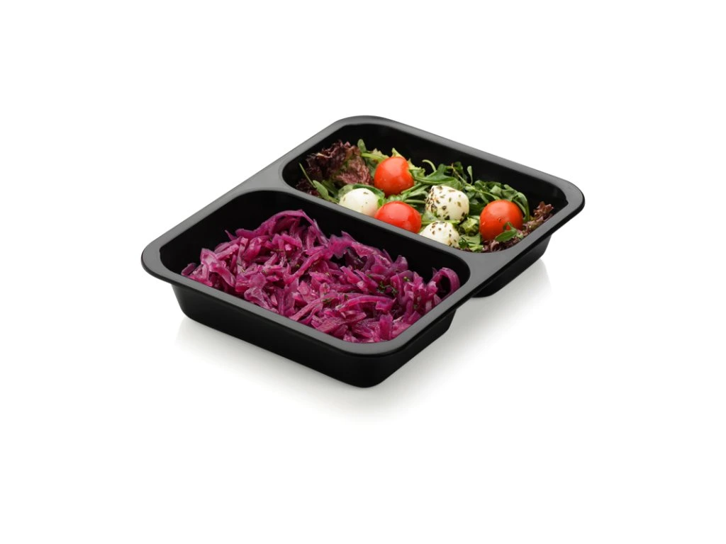 Miska MENU 227 x 178 mm x h 50 mm 2 dílná černá určená k balení horkých i chlazených hotových jídel k zatavení folií.Možnost individuálních cen, volejte 603 888 896.